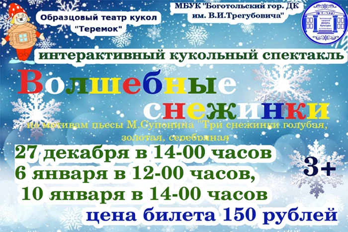 Сегодня во Дворце культуры состоялся кукольный спектакль «Волшебные снежинки» по мотивам пьесы Михаила Супонина «Три снежинки: голубая, золотая, серебряная»!
