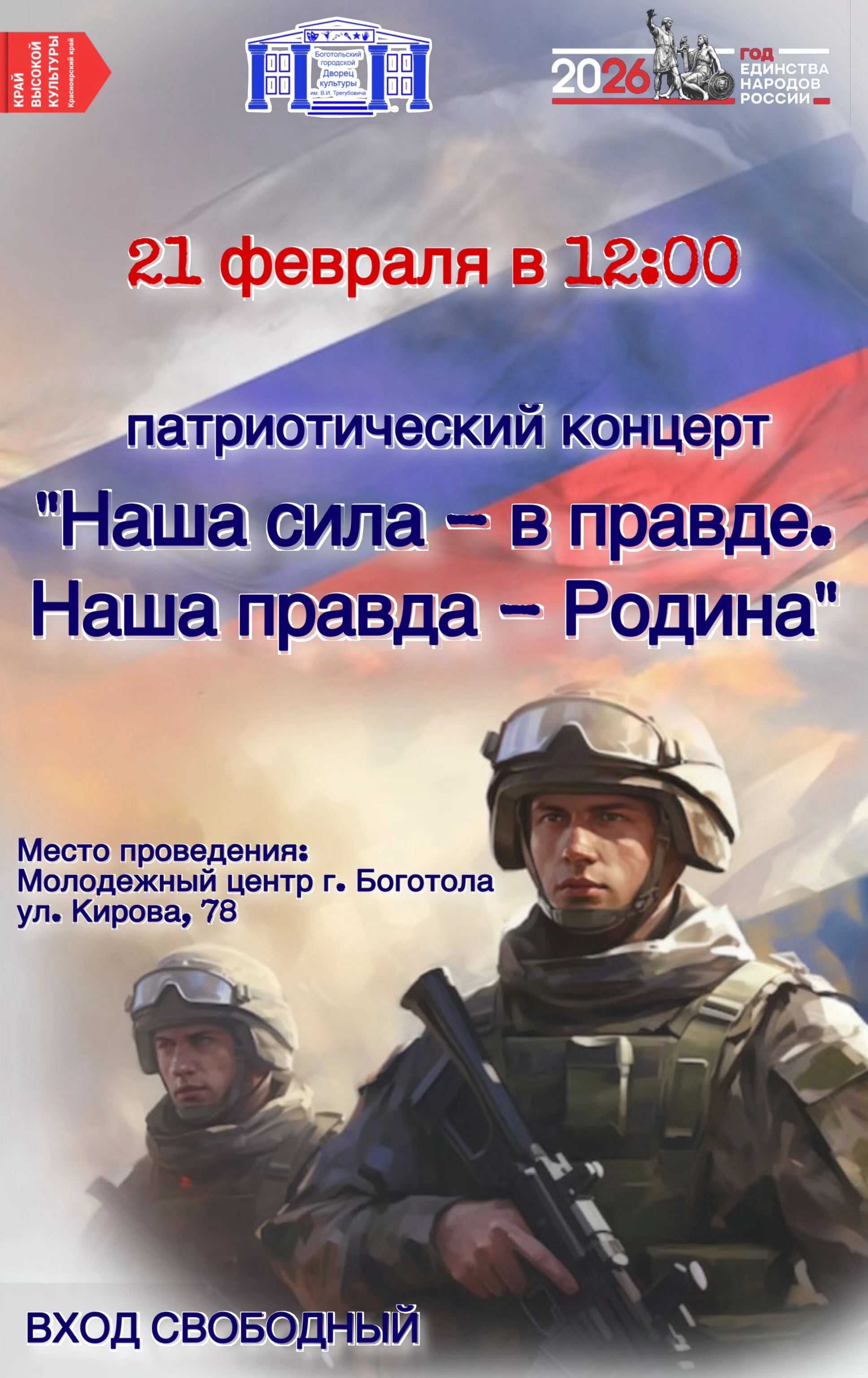В преддверии Дня защитника Отечества приглашаем вас на концерт, посвящённый любви к Родине, мужеству и исторической памяти.