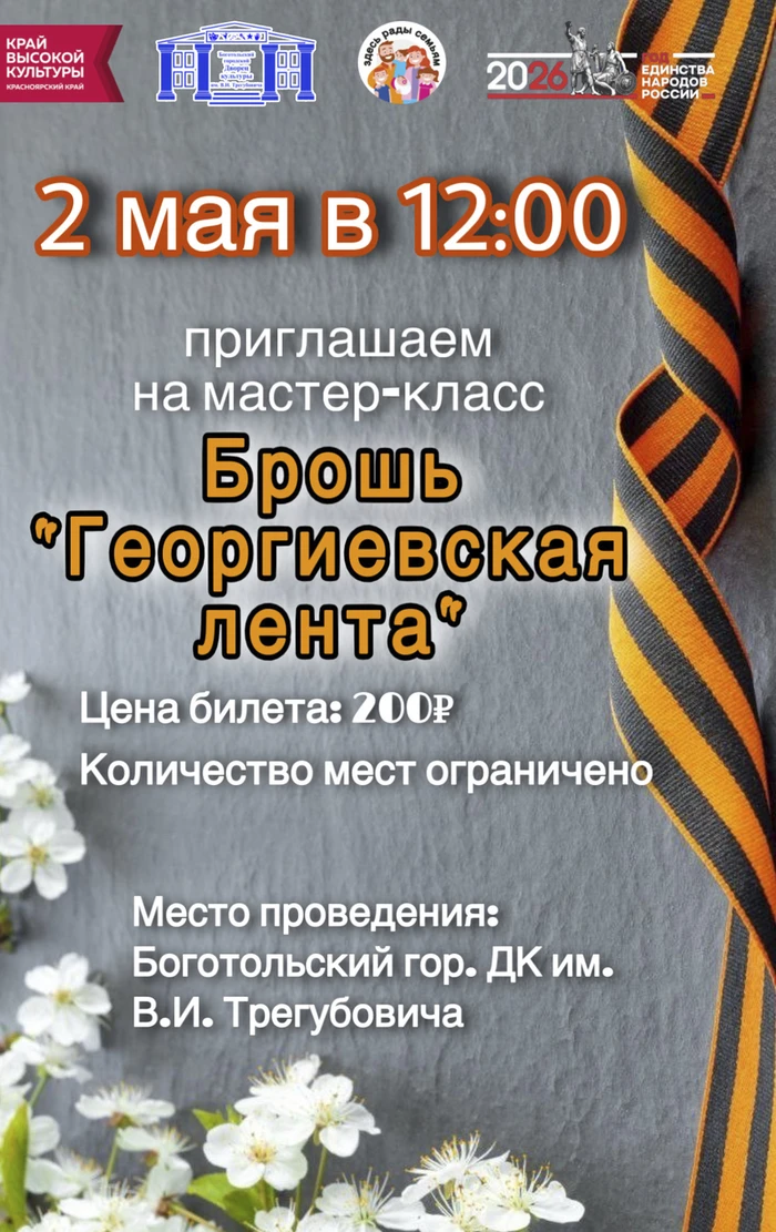 2 мая в 12:00 Приглашаем на мастер-класс БРОШЬ "ГЕОРГИЕВСКАЯ ЛЕНТА Цена билета: 200 р. Количество мест ограничено Место проведения: Боготольский гор.ДК им. В.И. Трегубовтча