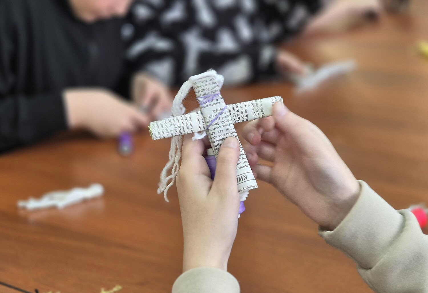 Вдохновившись рассказом, школьники своими руками создали куколок из газет, повторяя простые, но душевные техники военного времени. В процессе мастер-класса дети не просто мастерили, а учились бережно относиться к памяти, понимать цену подвига и ценить мирное детство.