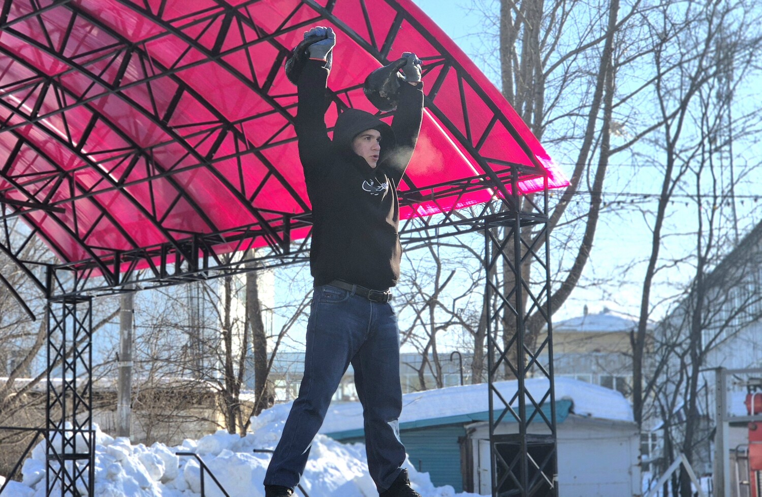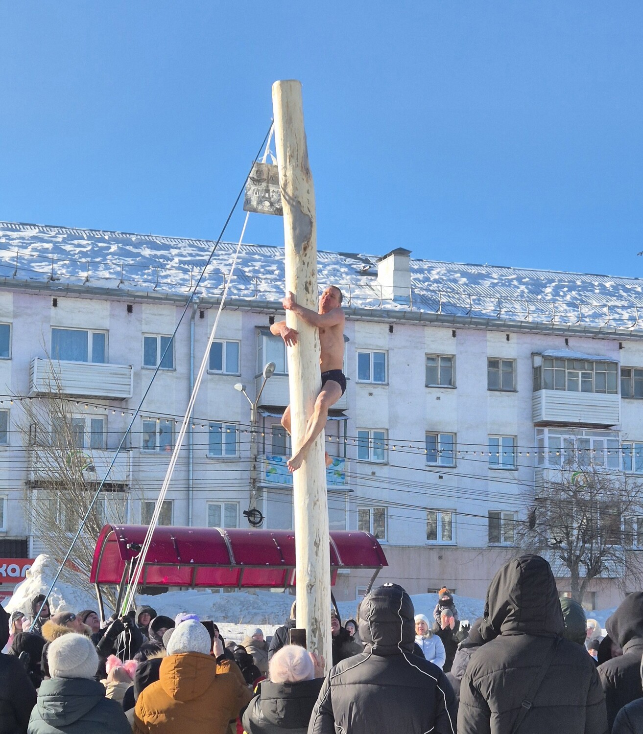 Силовые забавы: перетягивание каната, поднятие гири, залезание на столб