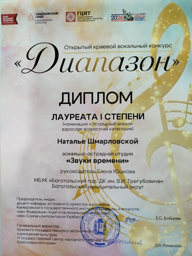10 апреля участники клубных формирований ДК отправились в Красноярск на Открытый краевой вокальный конкурс «Диапазон», организованный ГЦНТ Красноярского края. На площадке Дворца культуры имени 1 Мая встретились лучшие голоса края, и среди них уверенно прозвучали наши коллективы: