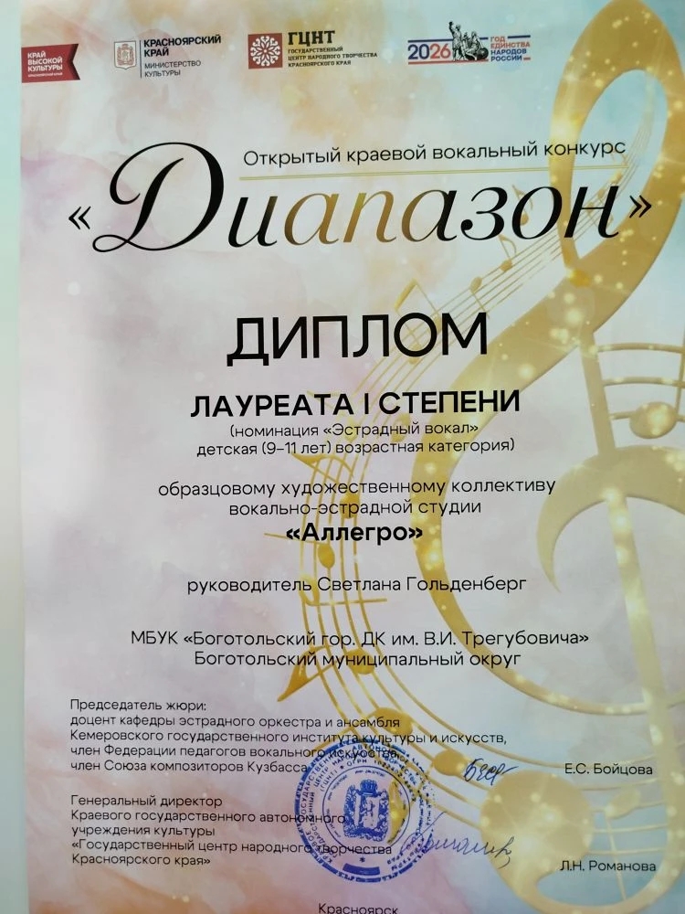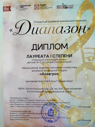 Образцовая вокально-эстрадная студия "Аллегро" - Диплом Лауреата I степени