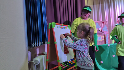 Ребята активно участвовали в действии: подбирали наряд для Колдуньи, украшали замок ромашками и превращались в черных котов.